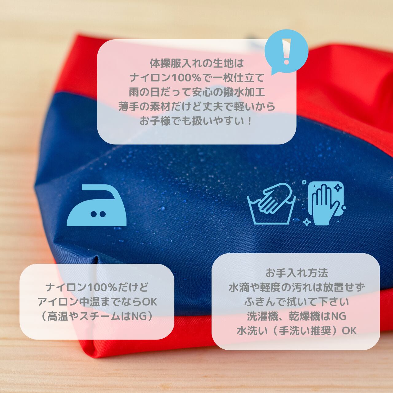 ・体操服入れに使用している素材は薄手のナイロン100%(撥水加工)、軽くて丈夫で水をはじくので雨の日でも安心!